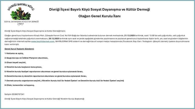Olağan genel kurul toplantısının Kirazlı Mah. Zübeyde Hanım Cad. No19/A Bağcılar-İstanbul adresinde bulunan dernek merkezinde, 21.12.2025 tarihinde, saat: 13:00’da salt çoğunlukla, salt çoğunluk sağlanamadığı takdirde çoğunluk aranmaksızın, 28.12.2025 tarihinde aynı saat ve yerde aşağıdaki gündemle yapılmasına ve yapılacak genel kurul toplantısına ilişkin tarih, yer, saat ve gündem bilgilerinin derneğimizin internet sayfası